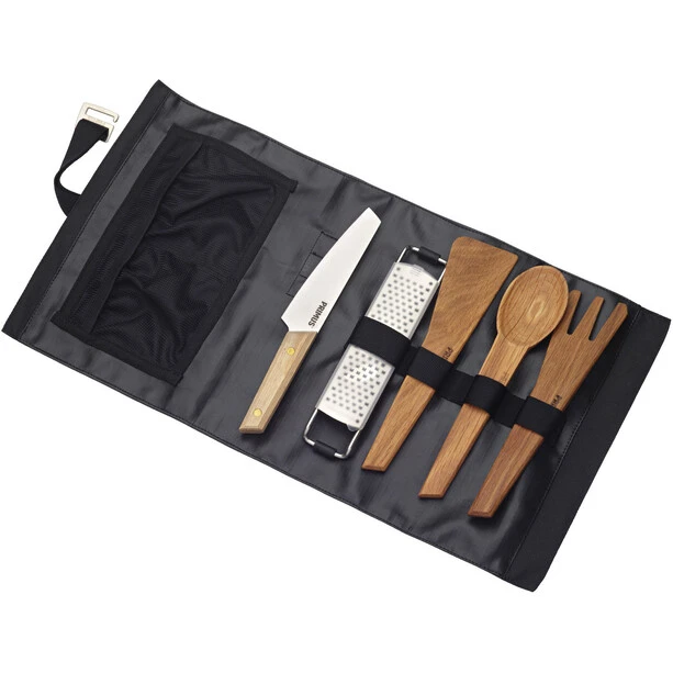 La mise en place pour sur la route. Tout bien rangé et en un seul endroit. Un ensemble d’accessoires en coton mélangé avec tout ce dont vous avez besoin pour préparer un merveilleux repas en plein air. L’ensemble dispose d’une pochette pour d’autres accessoires et peut être facilement déroulé ou accroché. Lorsque vous avez fini de cuisiner, vous pouvez simplement brancher les ustensiles que vous utilisez, les enrouler et les emporter chez vous.