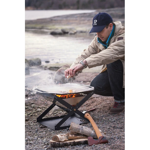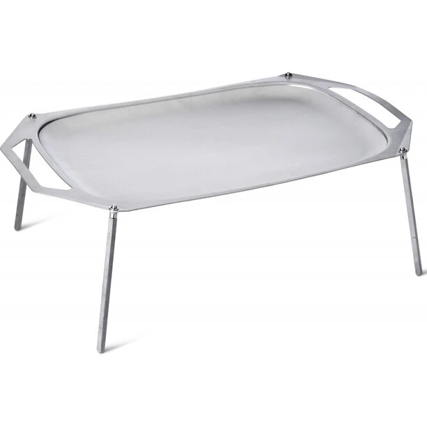 Permet de cuisiner au wok, de frire et de griller sur un feu ouvert Cuisiner sur un feu ouvert ne signifie pas seulement préparer un repas chaud. Il s’agit de l’expérience des flammes, des odeurs et de la chaleur. Les poêles bénéficient d’un matériau sandwich unique à trois couches, composé d’un fond en aluminium avec une surface en acier inoxydable sur les parties haute et basse de la poêle. L’aluminium bénéficie d’une conductivité thermique sans équivalent et réduit le poids par rapport à l’acier. D’autre part, l’acier inoxydable est facile à nettoyer tout en résistant aux rayures et à la corrosion. Cette combinaison réduit le poids de 35 % par rapport à l’acier et assure une bien meilleure diffusion de la chaleur que les poêles en acier classiques. La forme de la poêle présente un léger creux dans sa partie centrale, permettant de faire des fritures. Les bords sont légèrement arrondis, facilitant par exemple le retournement des crêpes, de la viande, etc. Sur les côtés, deux poignées permettent de positionner la poêle au bon endroit sur le feu. Les pieds en acier inoxydable sont vissés dans des pattes spéciales qui ne se bouchent pas avec la graisse ou la suie. Les pieds eux-mêmes disposent d’un filetage spécial qui évite les dommages. La section transversale rectangulaire des pieds procure une meilleure adhérence pour monter et démonter les pieds. Disponible en deux formats, 46×59 cm (18.1”x 23.2”) et 47×76 cm (18.5”x 29.9”).